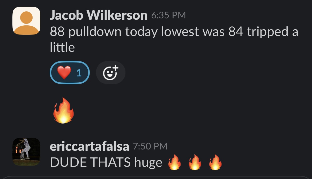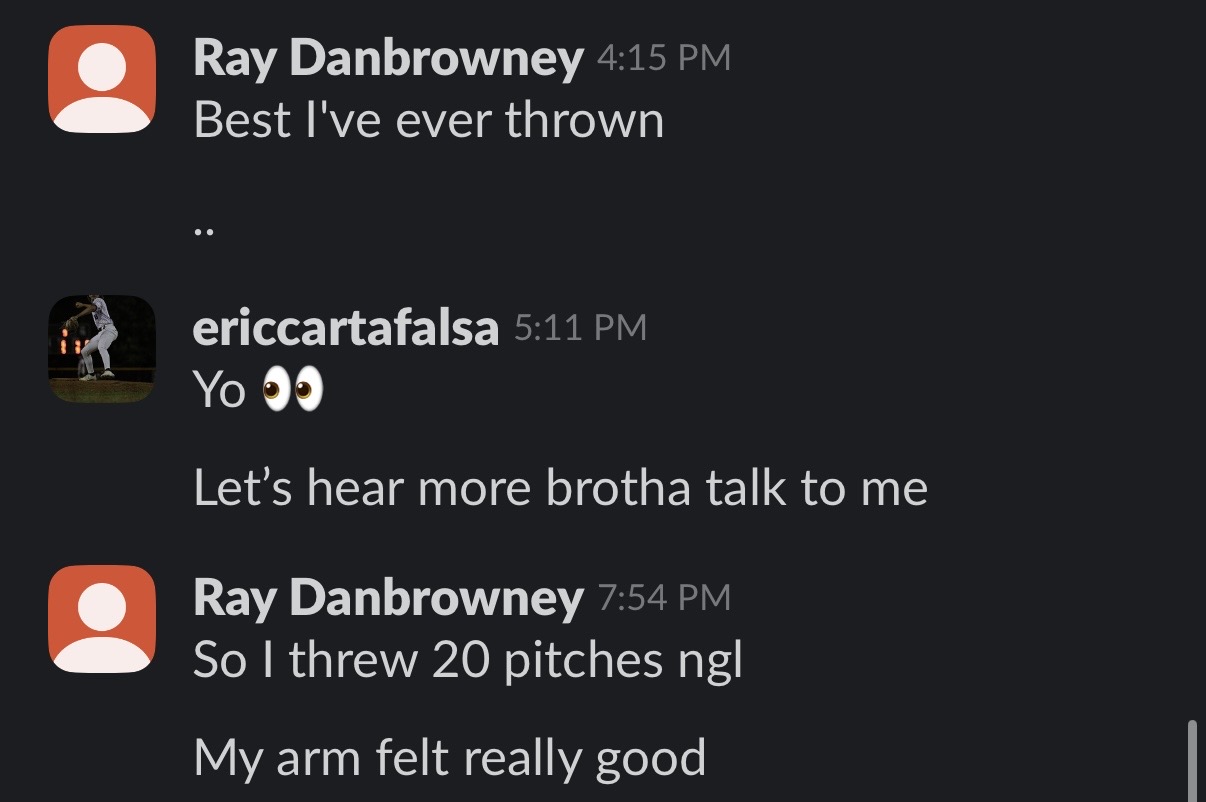 "I was up to 78 today and hit it 3 times in a row. I was also 77-78 almost the entire pen. My arm felt amazing too definitely the best it's felt this year"