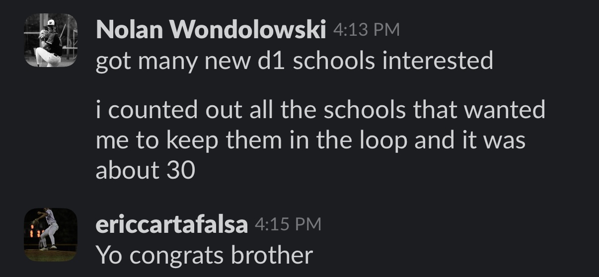 "Got many new D1 schools interested. I counted out all the schools that wanted me to keep them in the loop and it was about 30"